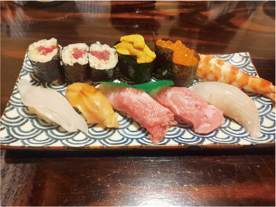 (左上から)鉄火巻き、ウニ、イクラ、車エビ、イカ、赤貝、大トロ、中トロ、白身