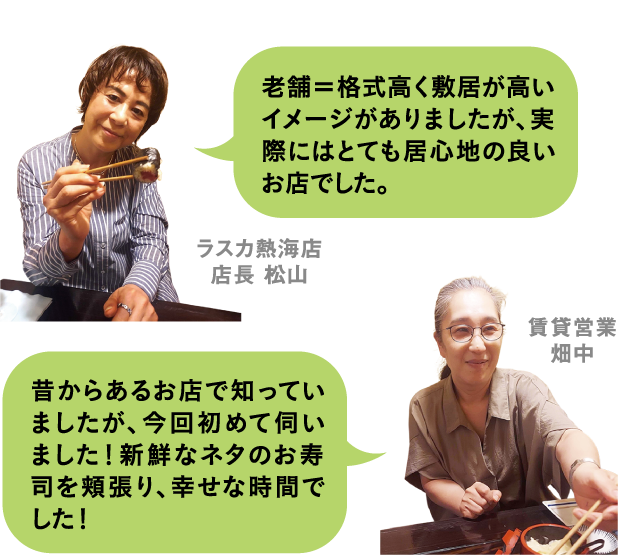 今回は、ロイヤルリゾートの熱海エリアを支えるベテラン社員3名(ラスカ熱海店 店長 松山、賃貸営業 畑中、営業事務 佐藤)が仕事を終えた後に、夜の熱海で美味しいお寿司とお料理を堪能してきました。