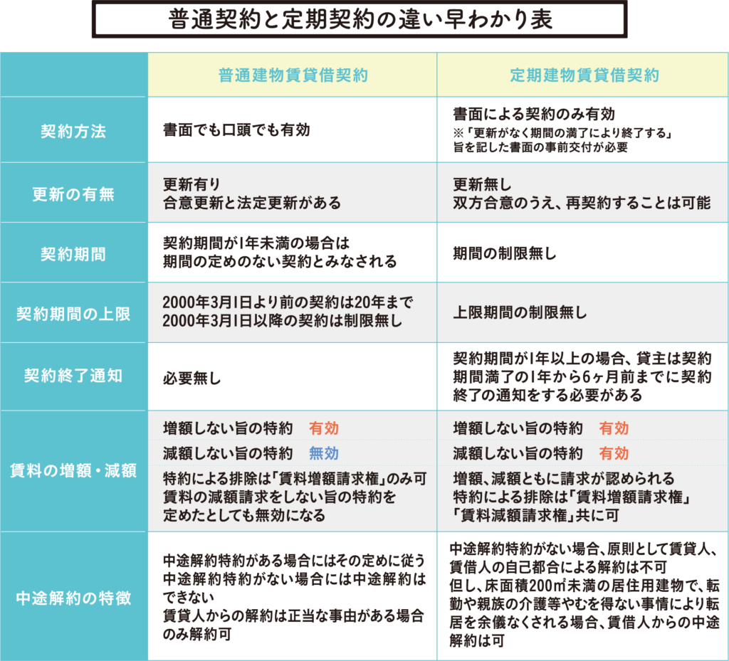 「普通建物賃貸借契約」は、賃借人の希望があれば契約更新によって同じ物件を長く借り続けることができます。一方、「定期建物賃貸借契約」は契約期間が決められており、(法定)更新がなく、契約期間が満了すれば終了する契約です。
