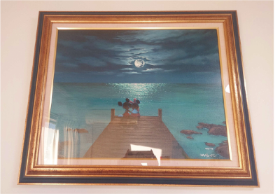 デパートのディズニーアートコレクションの展示会に立ち寄り一目惚れした絵画です。当時利用していた伊豆山のマンションから見えるムーンロードとこの絵画の情景が重なり、その部屋に飾るためにお給料1ヶ月分以上を奮発して購入しました。今は自宅の子供部屋に飾っています。