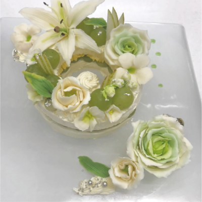 細かい作業が得意です。写真は、前職でパティシエをしていた際に作ったチョコレート細工のお花のケーキで、ケーキから装飾まで中澤作です!葉っぱも食べられるところがポイントです!